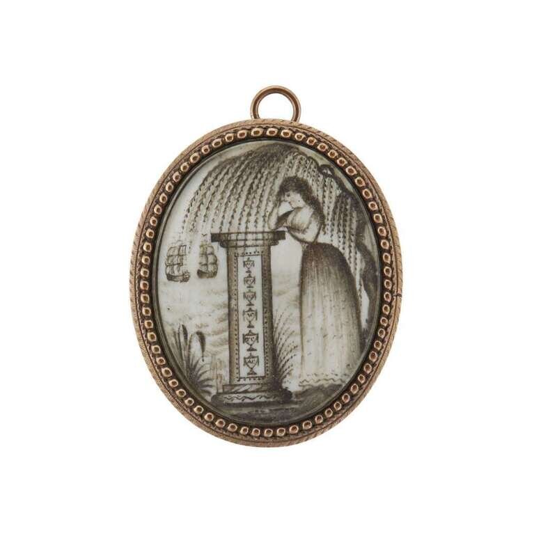 Of oval form, paitned with female mourner beneath willow tree, leaning on plinth decorated with stacked urns bearing initials (from the bottom): "AC," "TC," "AC" "IC" "PC" and "AC," two ships sailing in the distance, beaded gold surround, loop attachment, seemingly unmarked.