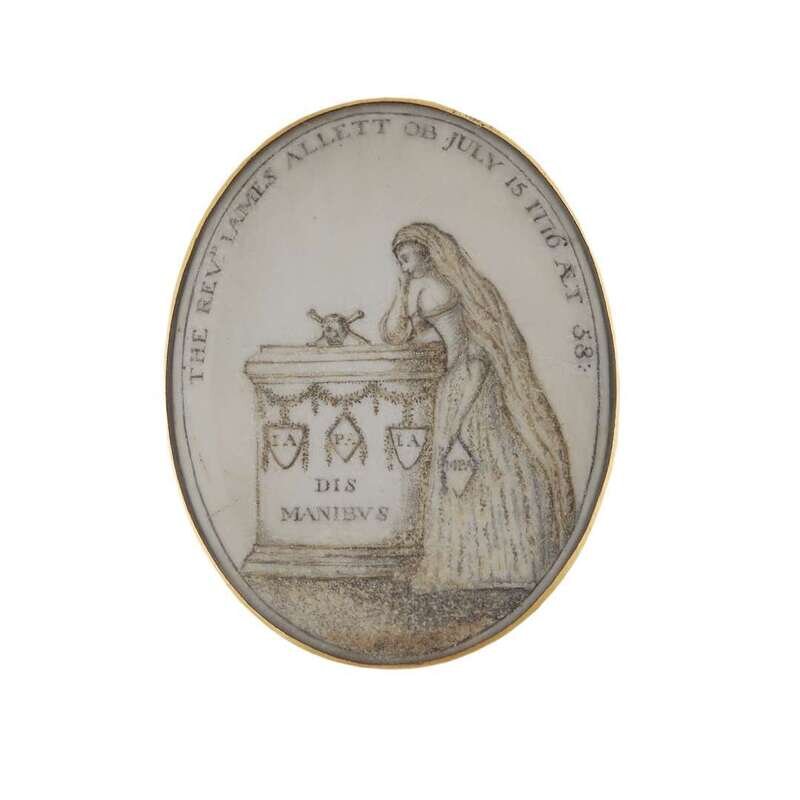 Of oval form, painted with female mourner holding handkerchief initialed, "MPA," and leaning on plinth topped with skull and crossbones and hung with shields bearing the initials, "IA" "PA" and "IA," respectively, above inscription, "DIS/ MANIEVS," further inscribed along top edge, "THE REVD IAMES ALLETT OB JULY 15 1776 AET 58," seemingly unmarked.