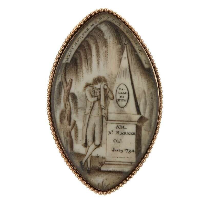 Of marquise form and painted en grisaille, depicting male mourner weeping beside obelisk raised on plinth, the obelisk inscribed, "FI-/ LIAL/ PI-/ ETY," the plinth inscribed, "S.M. / SH. BARKER/ Obi/ July 1794," weeping willow tree above surmounted by inscription, "WEEP NOT FOR ME, BUT FOR YOURSELF," the reverse fitted with pin, seemingly unmarked.