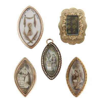 All of marquise form, the first, depicting man leaning on plinth with skull and crossbones and topped with covered urn, seed pearl surround, the reverse fitted with pin and loop attachment; the second, with shepherdess and sheep, fitted with loop attachment; the third, with woman lamenting at urn on plinth inscribed, "In/ Memory/ of a/ Friend," the reverse inscribed, "Jane/ McCarthy/ Obit June/ 1788/ AE 41" and fitted with pin; together with two hairwork pins/pendants.