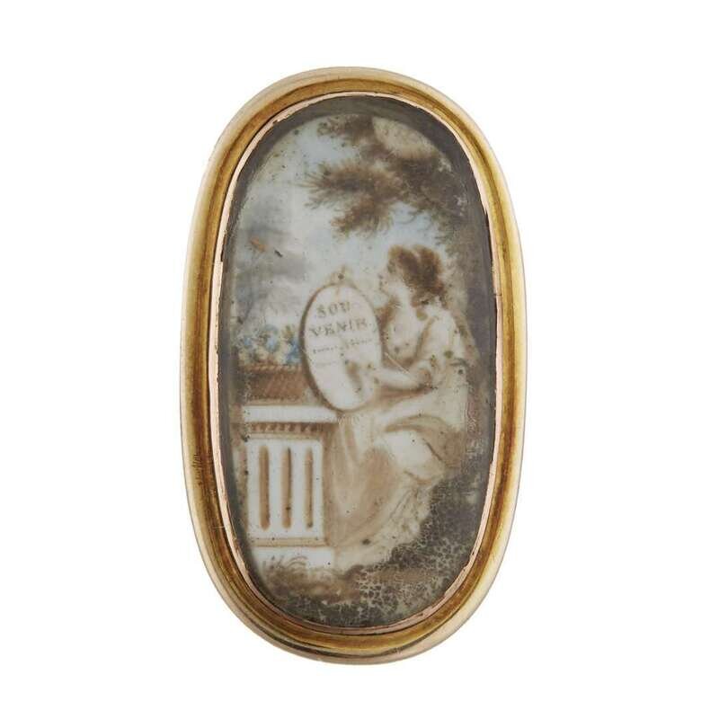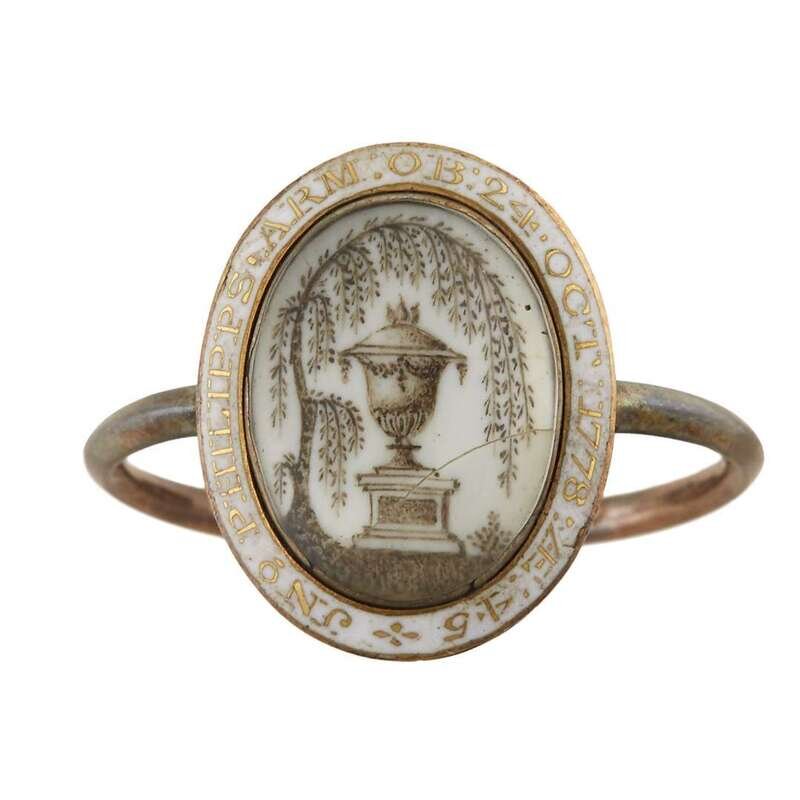 Of oval form, with covered urn on plinth beneath weeping willow tree, the surround inscribed, "JNO PHILLIPS ARM OB: 24. OCT: 1778: AE: 4.5," against white enamel ground; together with an oval mourning pin depicting female figure holding tablet inscribed, "SOU-/ VENIR" and seated beside column topped with basket of flowers, the reverse inscribed, "Charnick/ 22. Feby/ 1791," both seemingly unmarked.