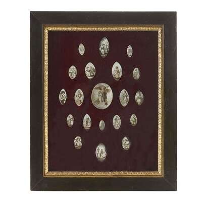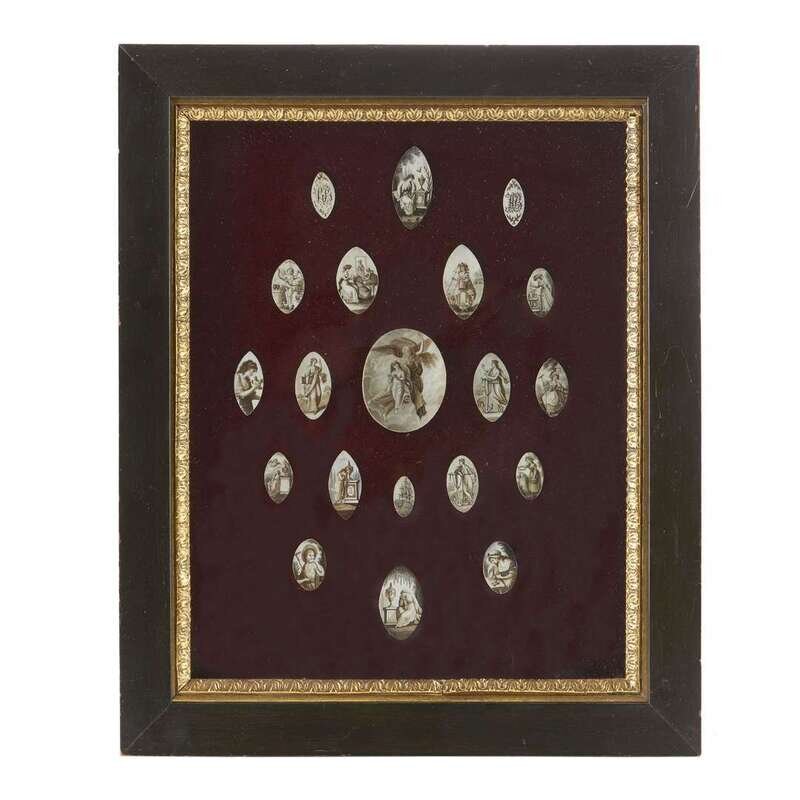 Representing various sentiments including grief, hope, friendship, innocence and love; each watercolor on ivory, some with polychrome enhancement, mounted on plum velvet ground, framed.