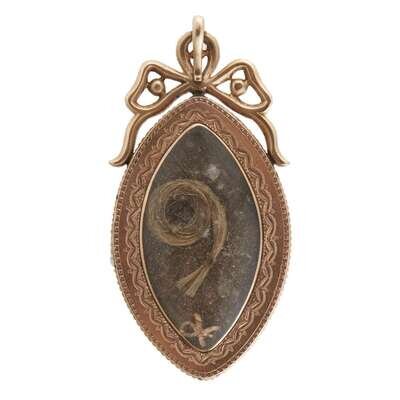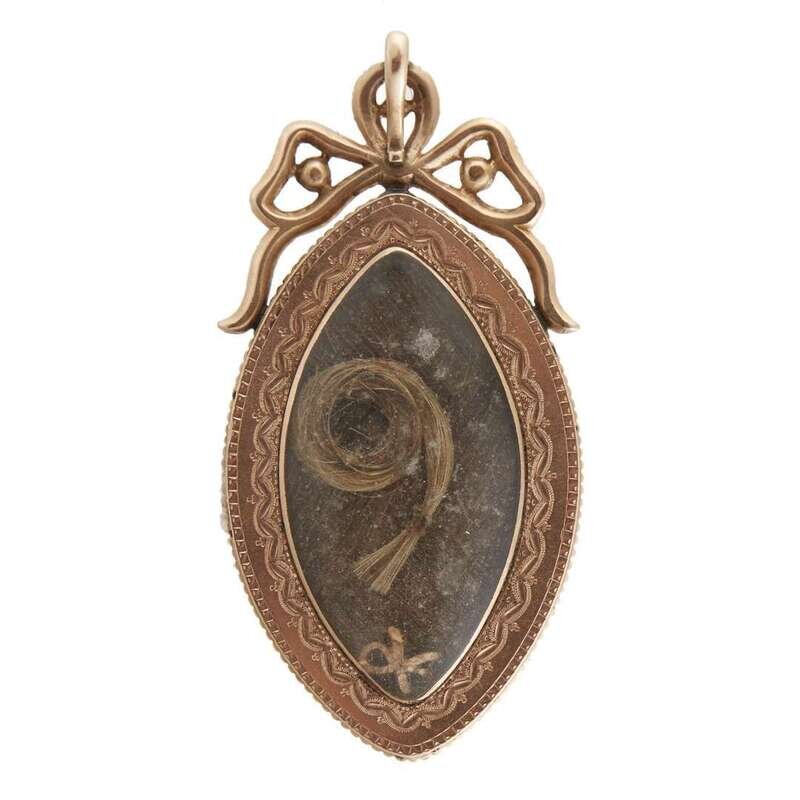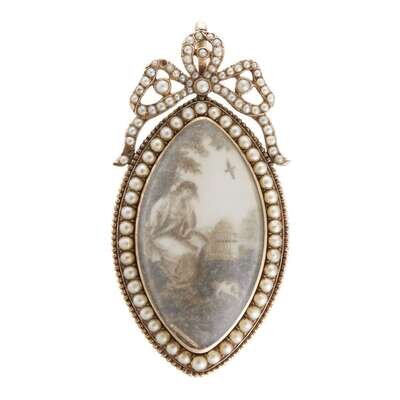 Of marquise form, painted en grisaille, depicting mourning woman seated beside a raised, open birdcage, dog at her feet, bird flying overhead; seed pearl and beaded gold surrounds topped with seed pearl bow, the reverse set with woven hair, seemingly unmarked.