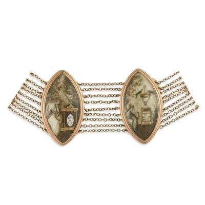 With two marquise-shaped miniatures; the first, painted with female figure mourning beside raised plinth bearing the initials, "E.M & I.C" on hairwork knoll and surmounted by covered urn; the second, with woman seated beside urn with birds on raised plinth inscribed, "SACRED/ TO/ FRIEND/ SHIP," the reverses engraved, "M. Feariss," joined with gold chain links, later clasp marked "12K."