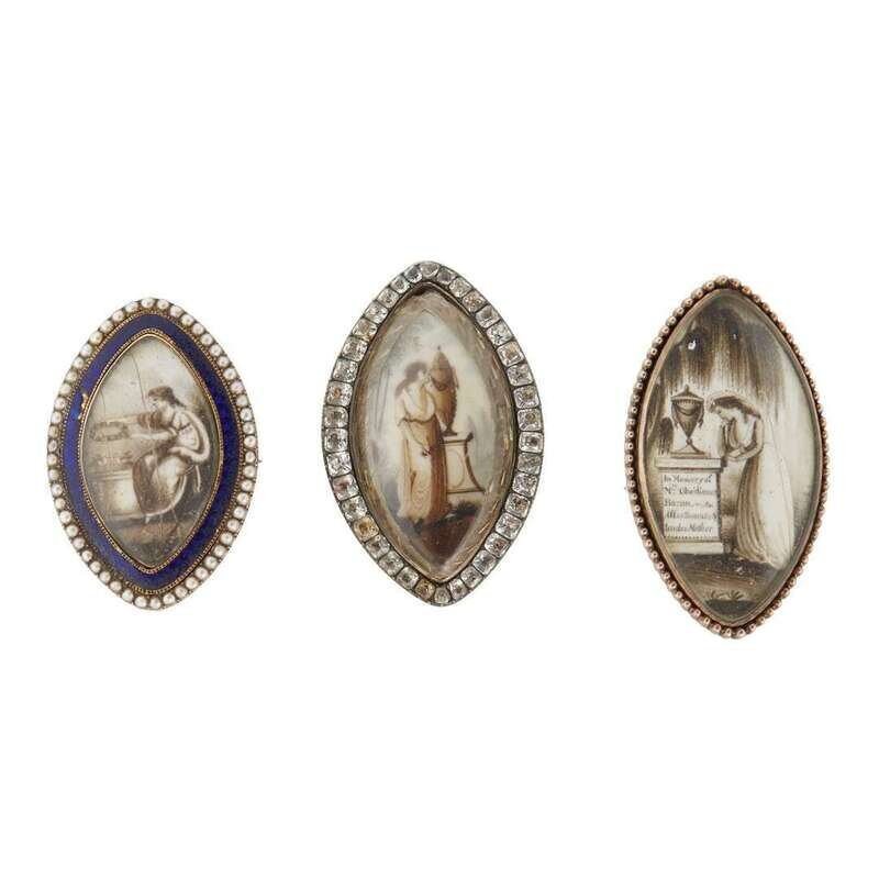 All of marquise form, the first, painted en grisaille, depicting woman weeping beside covered and swagged urn surmounting plinth inscribed, "In Memory of/ Mrs Obedience/ Bacon. - An/ Affectionate/ tender Mother," with beaded gold surround, the reverse inscribed, "J Pannill,/ To/ A Pannill," fitted with pin and pendant loop; the second, depicting female figure holding a flowered wreath above a pair of doves, with blue enamel and seed pearl surrounds, the reverse fitted with pin; and the third, depicting female mourner lamenting beside a covered urn, with paste surround, the reverse fitted with pin and pendant loop, all seemingly unmarked.