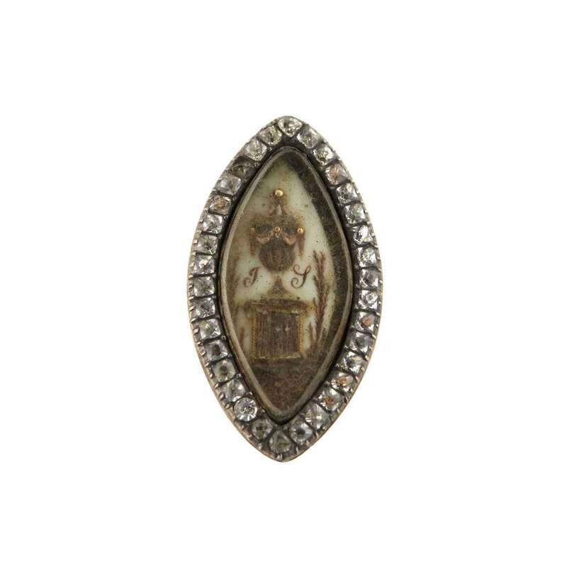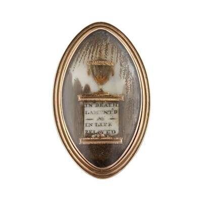 The first, of marquise form, with raised hairwork urn flanked by the initials, "JS," marcasite surround, the reverse inscribed, "Jane/ Spencer/ Ob 26 Octr/ 1783/ Ae 77"; the second, depicting raised urn on plinth inscribed, "IN DEATH/ LAMENTED/ AS/ IN LIFE/ BELOVED" with reverse-painted willow tree, the reverse inscribed, "Samuel/ Viney/ Died 19 May/ 1789/ Aged 65," both seemingly unmarked.