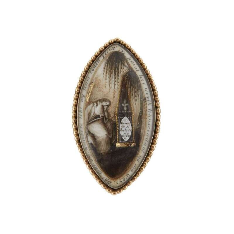 Of marquise form, painted with female mourner beside raised black plinth and obelisk with fleur-de-lis and inscription, "In/ Memory /OF A/ Beloved/ MO/ THER," under reverse-painted willow tree, with additional inscription on surround, "Oh! that my Numbers like my tears could flow To paint her worth transcendent as my woe," beaded gold surround, the reverse set with hair and applied gold cipher, fitted with pin and loop attachment, seemingly unmarked.