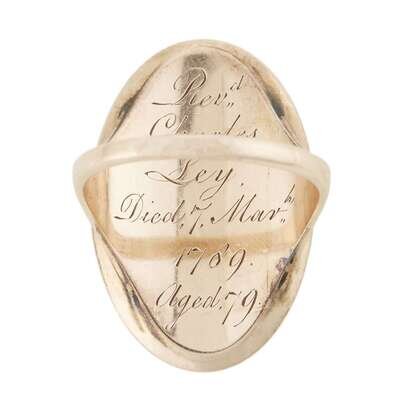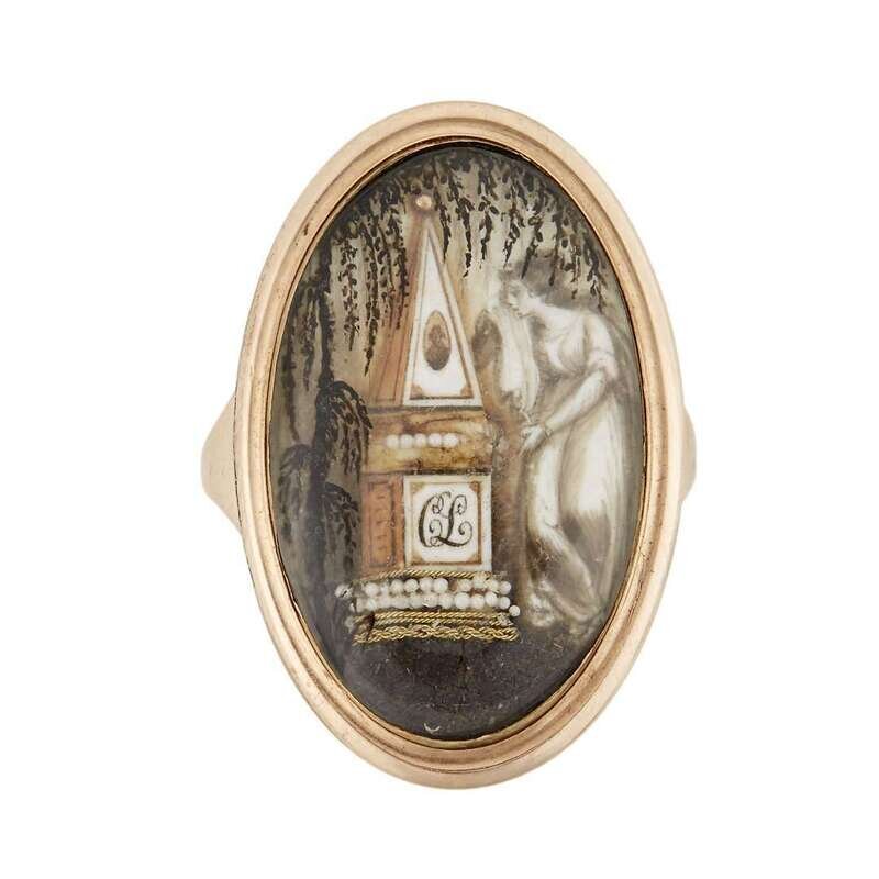 The oval reserve painted with female figure weeping beside raised obelisk, bearing the initials, "CL," and embellished with seed pearls and gold wire, beneath reverse-painted willow tree and atop hairwork hillock, engraved to verso, "Revd/ Charles/ Ley/ Died, 7 Marh/ 1789/ Aged 79," seemingly unmarked.