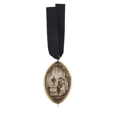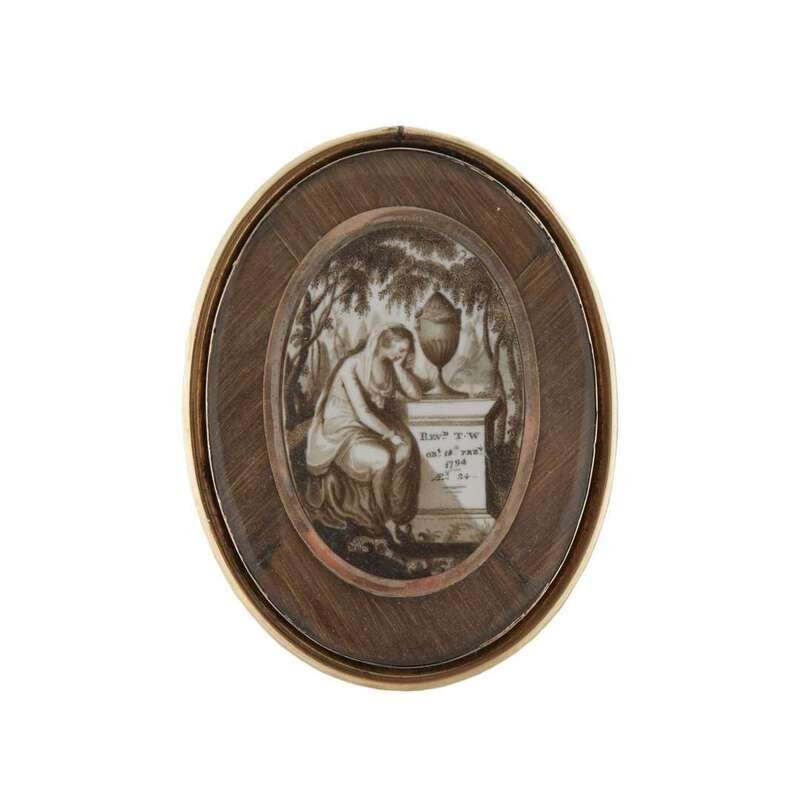 The first, of oval form, painted with female figure seated beside covered urn raised on plinth inscribed, "REVD T.W/ OBT 18TH FEBY/ 1794/ AET 24," with hairwork surround, the reverse set with hair and fitted with pin and loop attachment; the second, of marquise form, with woman seated beside urn raised on plinth inscribed, "REST/ IN/ PEACE," the reverse set with hair, fitted with pin and loop attachment threaded by black grosgrain ribbon, both seemingly unmarked.
