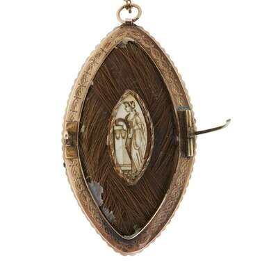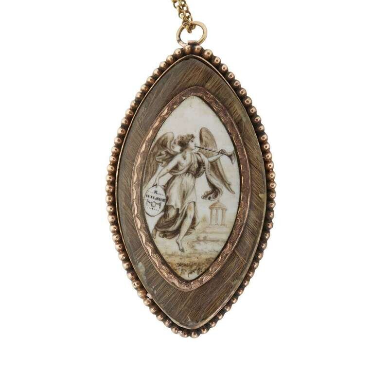 Of marquise form, painted with trumpeting Gabriel holding tablet inscribed, "R./ WILSON," Classical rotunda in the distance, hairwork and beaded gold surrounds; the reverse depicting lady leaning on plinth, hairwork surround, fitted with pin and loop attachment hung with link chain, seemingly unmarked.