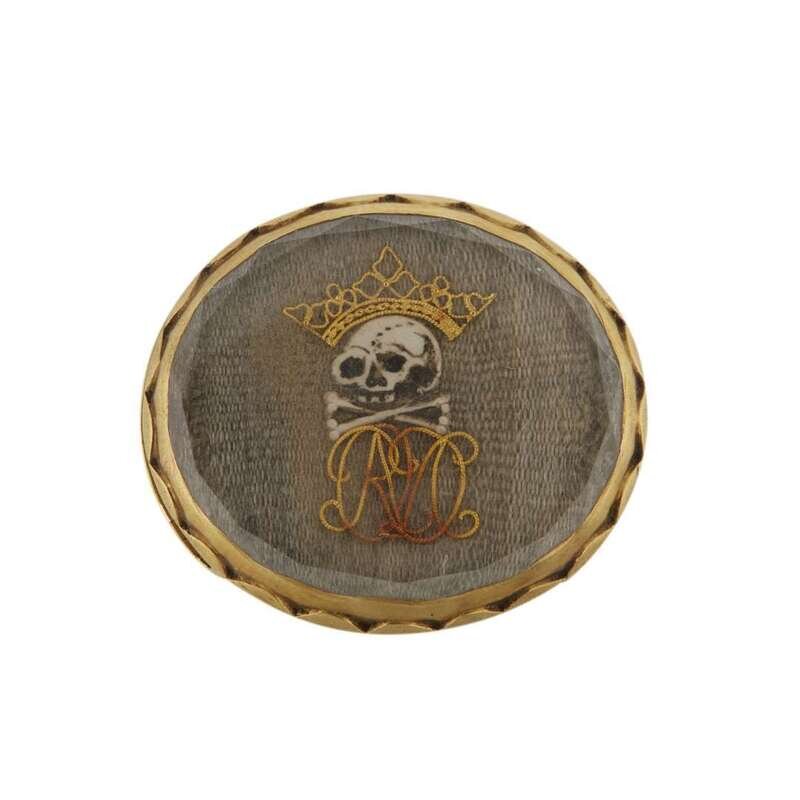 Of oval form, with crowned, enameled skull and crossbones above gold wire cipher, "RMC," all against hairwork ground and under faceted rock crystal, the reverse with loop attachments, seemingly unmarked.
