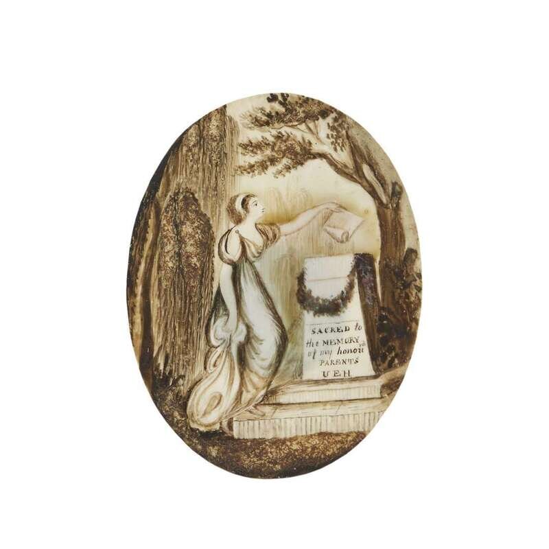 Of oval form, painted with woman holding scrolled parchment above monument inscribed, "SACRED to/ the MEMORY/ of my honourd/ PARENTS/ UEH," seemingly unmarked; together with three loose locks of hair, in red leather case.