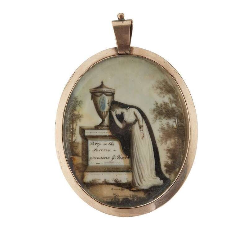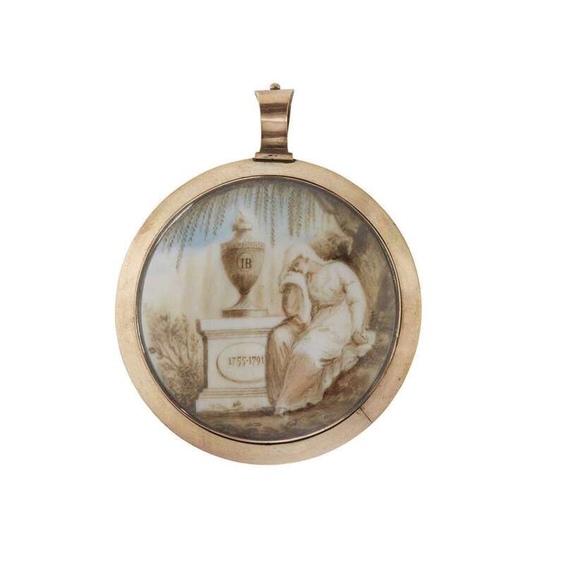The first, of circular form, painted with woman weeping beside urn initialed, "IB," on plinth dated, "1755-1791," the reverse set with hair, loop attachment; the second, of oval form, depicting shrouded woman lamenting beside covered urn supported by plinth inscribed, "Deep is the/ Sorrow/ genuine e/y Tear," the reverse set with hair, fitted with pin, loop attachment, both seemingly unmarked.