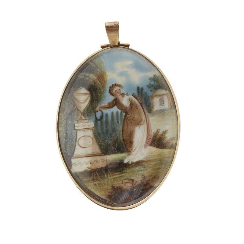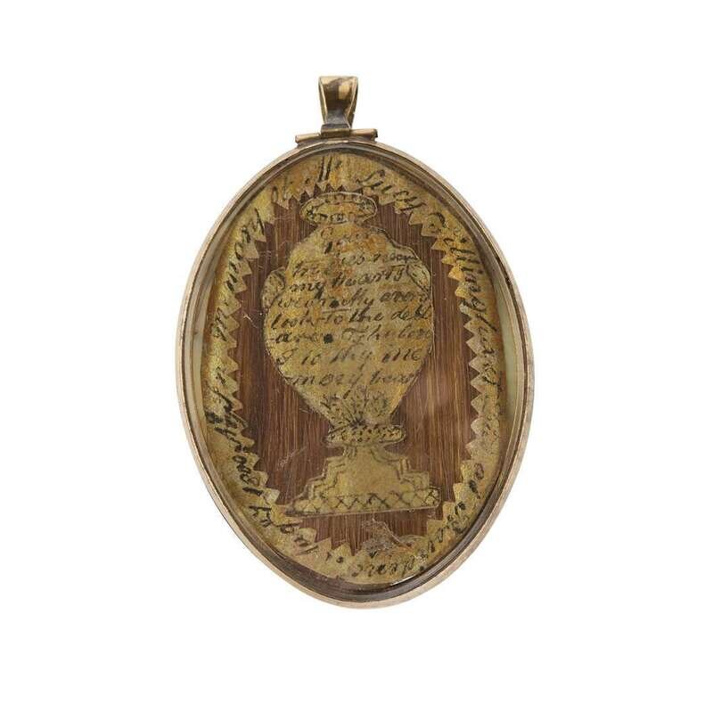Of oval form, paintd with woman holding wreath beside covered urn on plinth, house in the background; the reverse with hairwork ground with applied gold cut-foil urn and sawtooth border inscribed, "In Memory of H. Lucy Tillinghurst died at Providence Aug 7 1800," hinged loop attachment, seemingly unmarked.