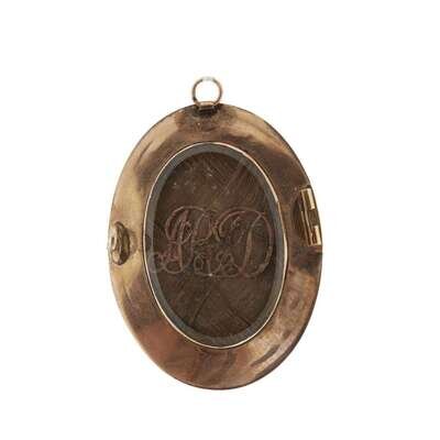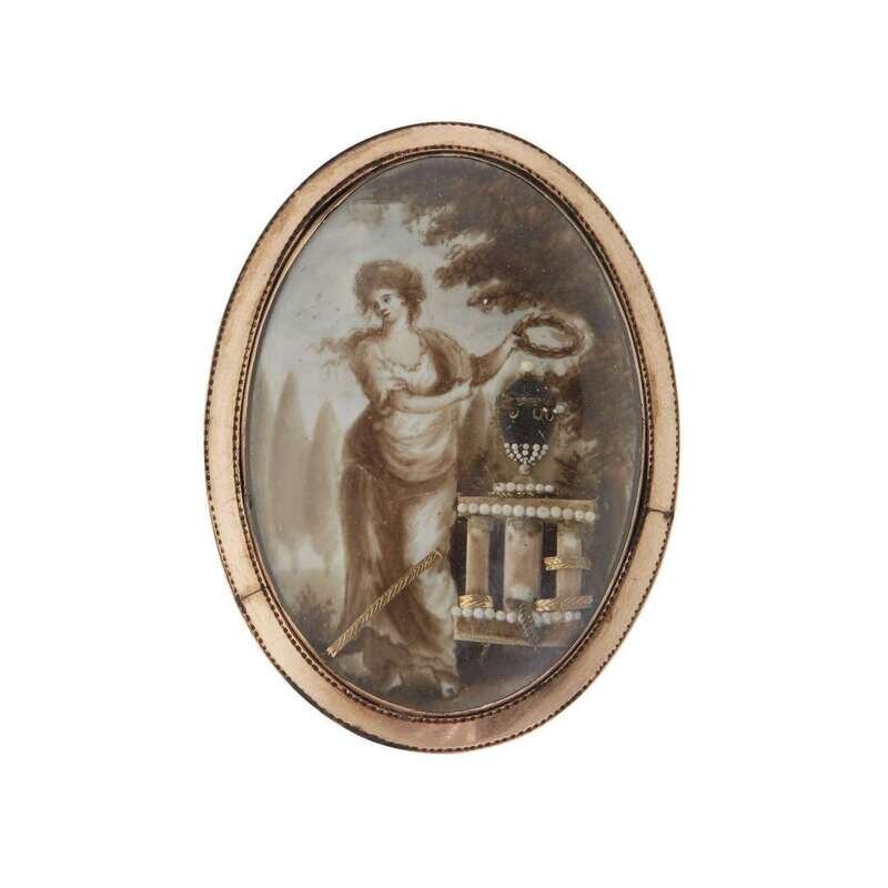 Of oval form, painted with female figure holding wreath above raised covered urn on raised columnar plinth, the reverse set with hair and gilt initials, "ARJD," and fitted with pin and loop attachment, seemingly unmarked.