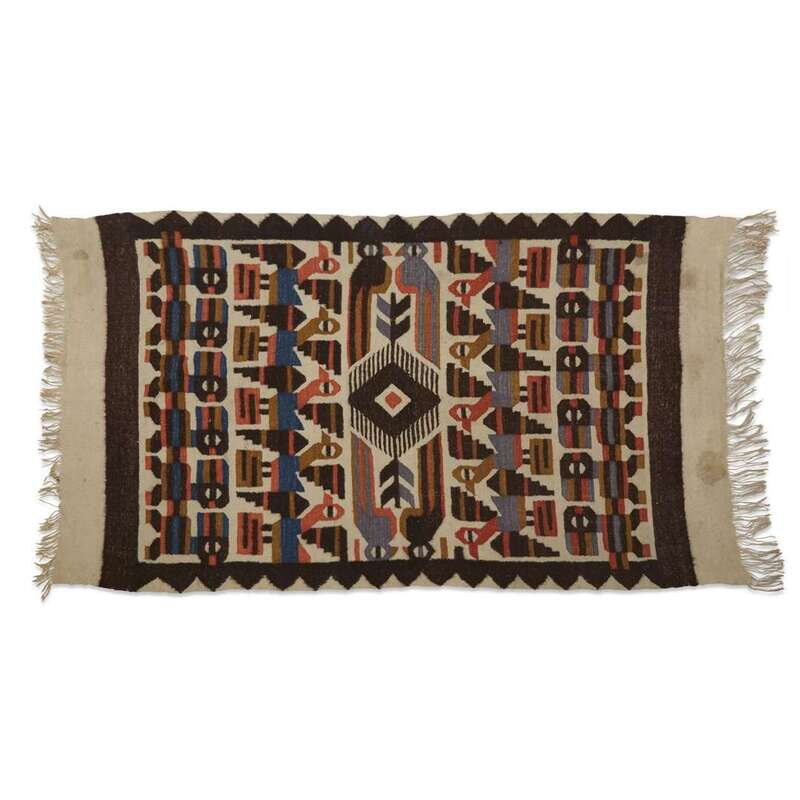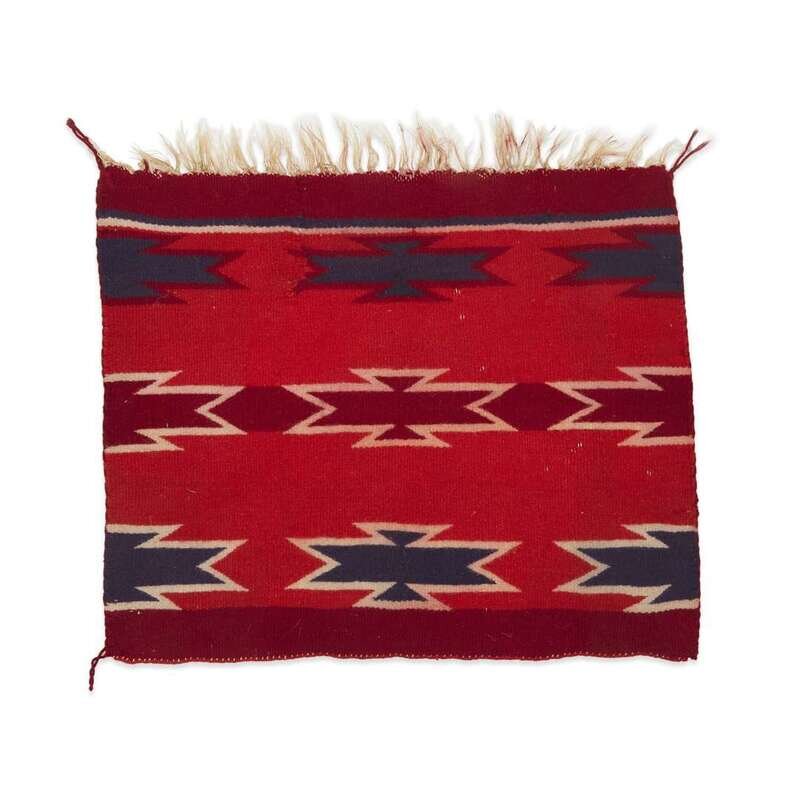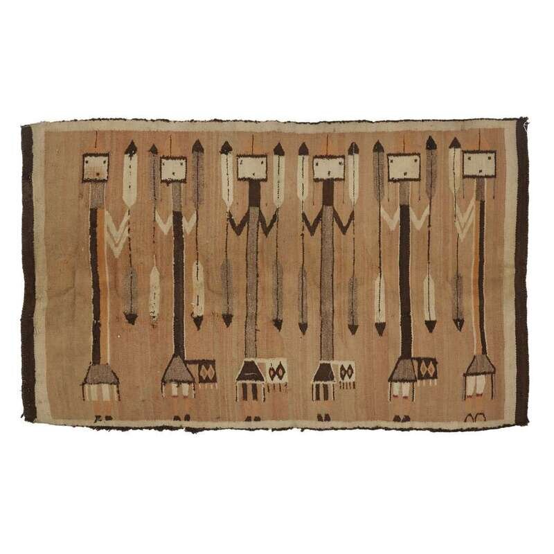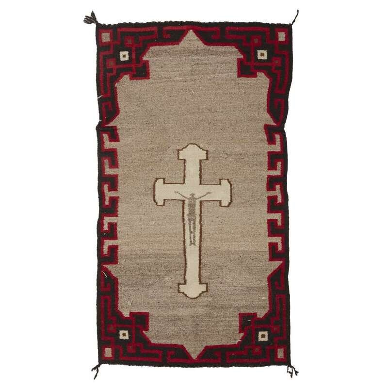 Comprising a turquoise blanket, a striped rug, a rug with a central crucifix, a figural Yei rug, two small mats, and a large blanket with Peruvian bird motifs. (7).