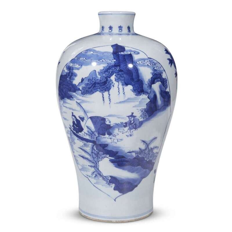 decorated with two figural panels to body, with peonies to shoulder and lappet band to neck.