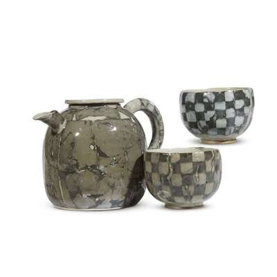 MARTIN MÖHWALD (GERMAN) TEAPOT AND TWO TEA BOWLS, 1992