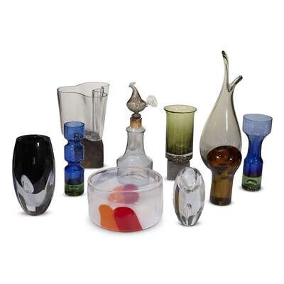 Ten works including Alvar Aalto Savoy vase, vessels by Timo Sarpaneva, Tapio Wirkkala, Kaj Franck and others. Most marked.