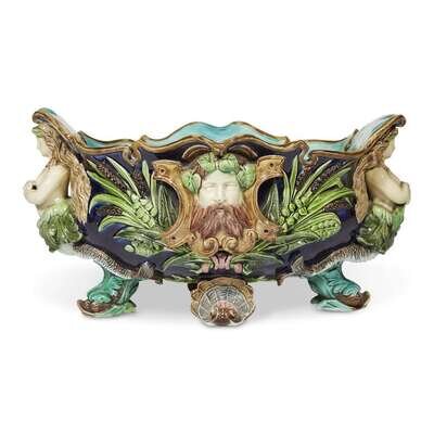 The surface decorated with mermaids, wild man faces, and cattails; the body raised on dolphin and shell-form feet; the bottom with impressed "double fish" maker's mark and pattern number.