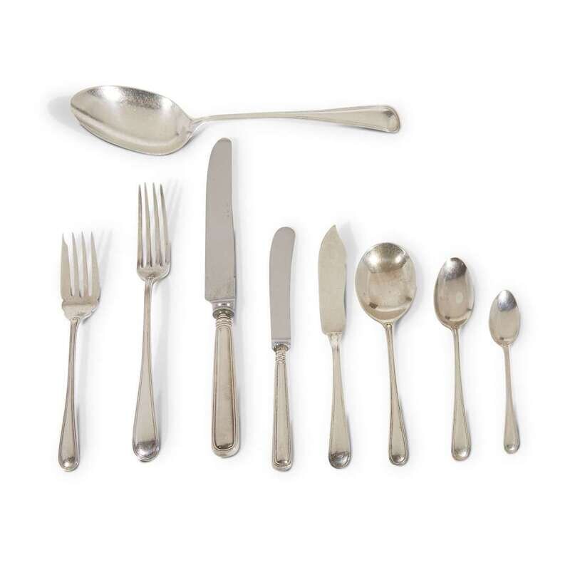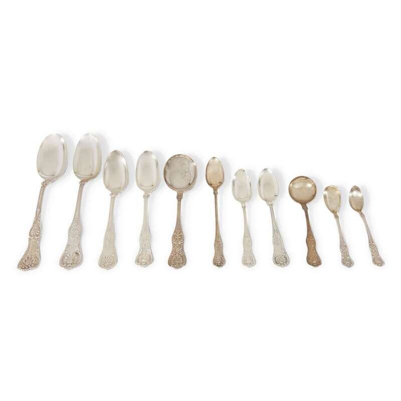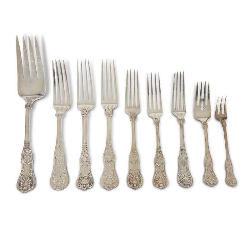 Most in the 'King' pattern, by J.E. Caldwell & Co., Tiffany & Co., Black, Starr & Frost, Birks, and other American and English makers; comprising tablespoons, teaspoons, serving spoons, dinner forks, salad forks, shrimp forks, serving forks, dinner knives, butter knives, and others; together with miscellaneous silverplated items.