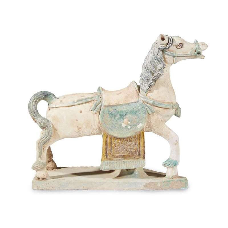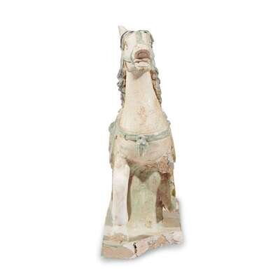 The horse is standing foursquare on a rectangular base, the body unglazed, mane, tail, and saddle in green glaze.