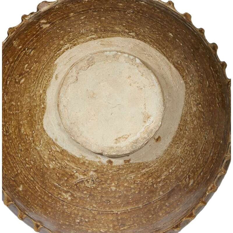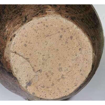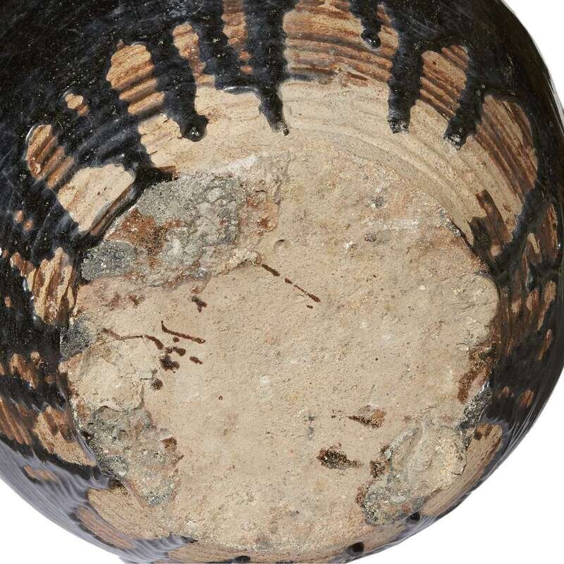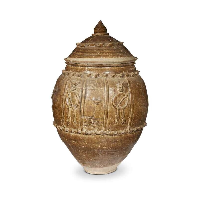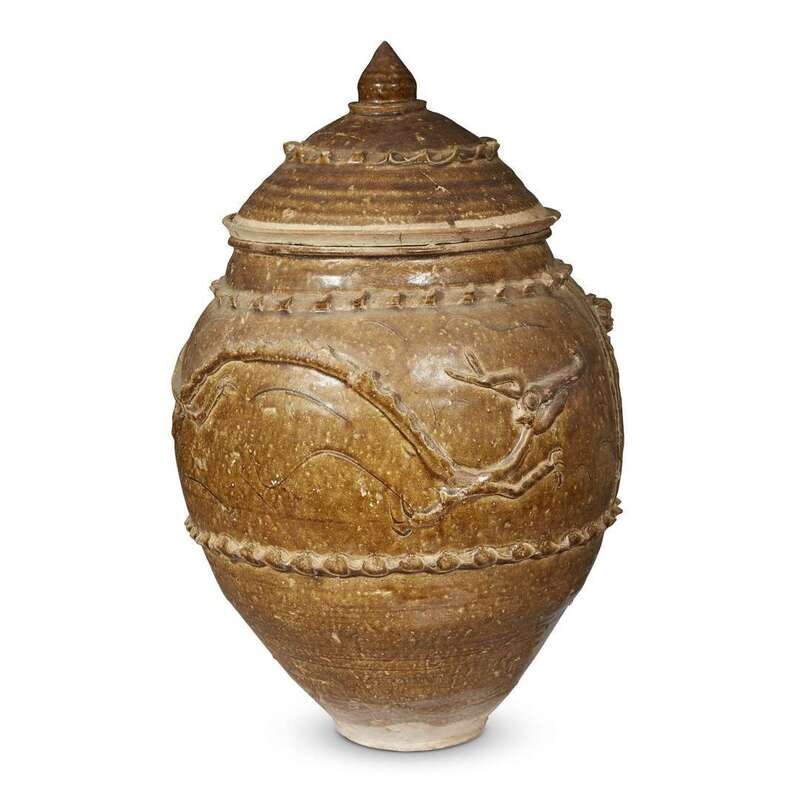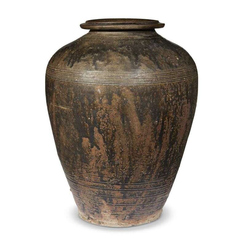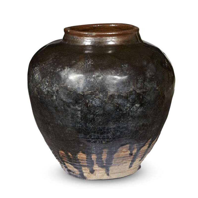 Comprising: a facetted globular dark brown-black glazed jar, possibly Henan province, Ming dynasty or earlier; an ovoid brown and black-glazed jar with ringed neck and shoulder, possibly Khmer or northern Thai, 12th-14th century; a pale brown-glazed "Dragon" jar with cover, possibly Yunnan province, with two applied figures and pinched borders.