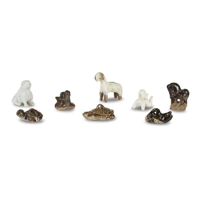 Comprising: three brown-glazed molded turtle pendants; a brown glazed bird pendant; a brown-glazed molded lion; a Ding-type crawling boy and a lamb (the lamb with green splashes); a porcelain seated dog.
