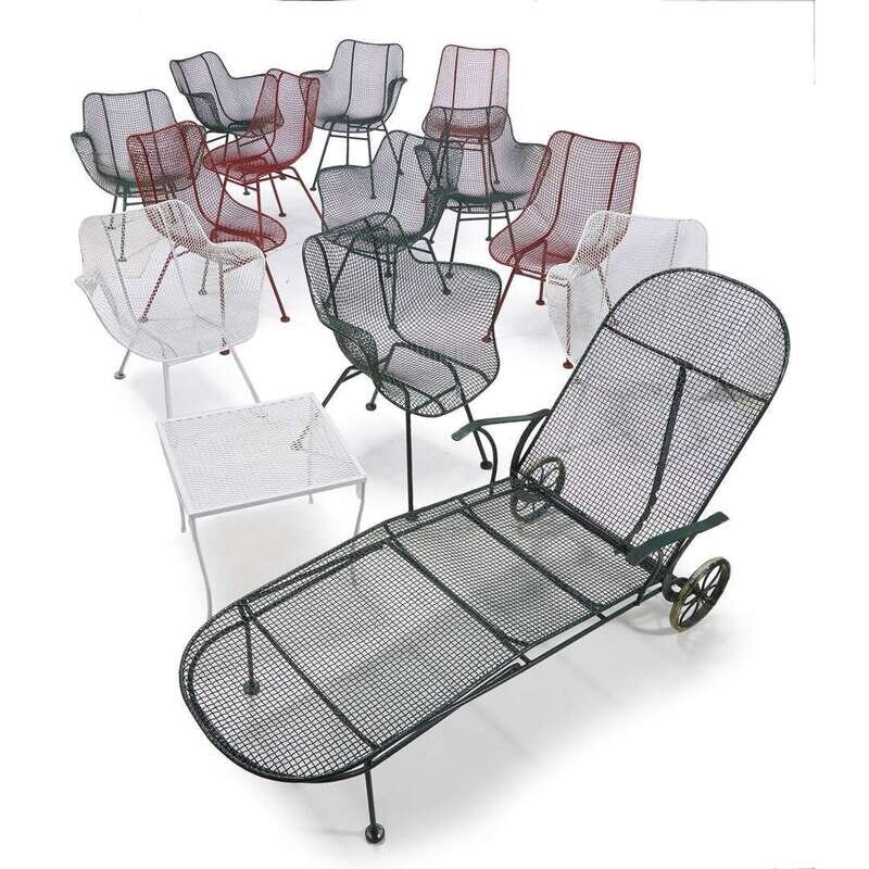 Painted iron Including chaise longue, side table, and twelve chairs.