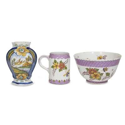 A Dutch Delft famille rose style mug and bowl probably mid 18th century