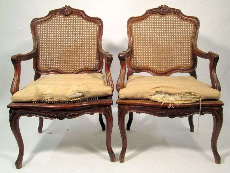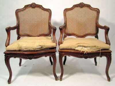 A pair of Louis XV style channel molded caned fauteuils late 19th century