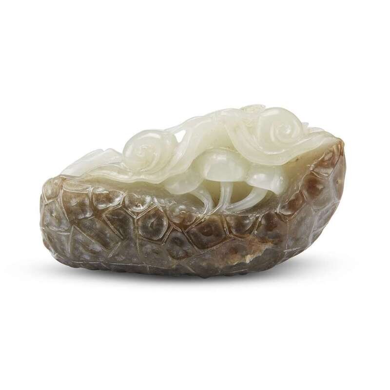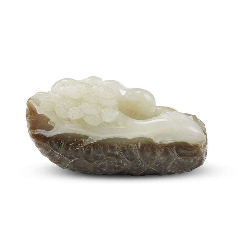 A Chinese carved white and brownish-grey jade "Snail, Mushroom, and Pine" pendant