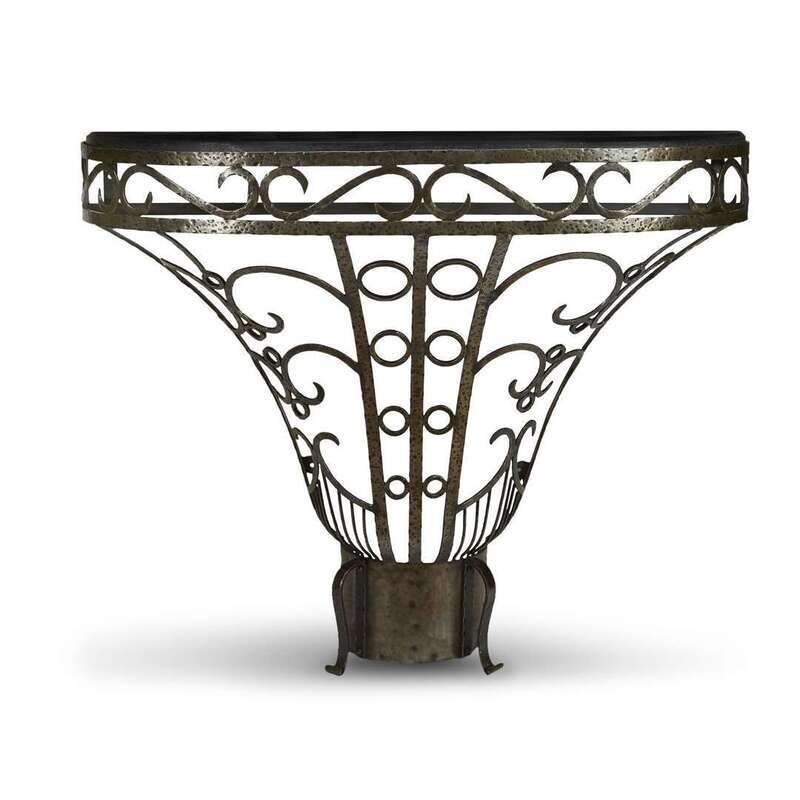 A French Art Deco wrought iron demilune console with bleu turquin marble top 20th century