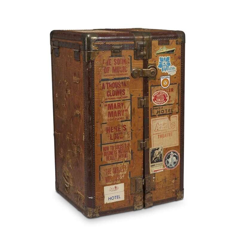 The interior fitted with drawers and clothes hangers, the exterior decorated with Broadway tour stickers, bearing Hartmann and "Gibraltarized" labels.