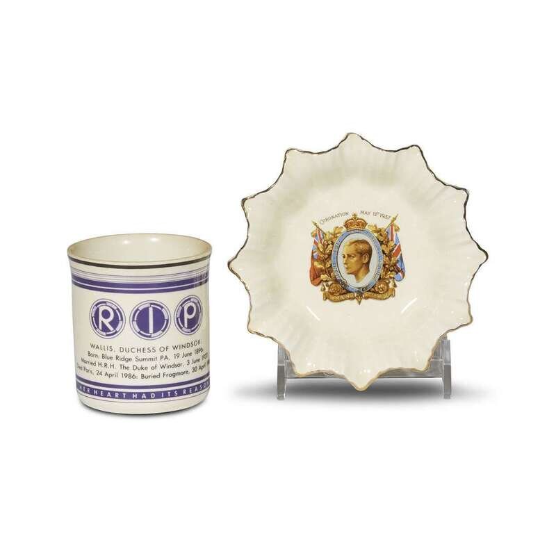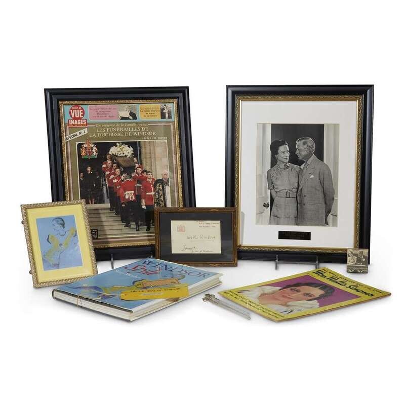 Comprising a framed autograph: a type-written letterhead on board the R.M.S. Queen Elizabeth, signed "Edward/Duke of Windsor" and addressed to "Wallis Windsor," dated November 9th, 1946; a Duchess of Windsor luggage tag retaining an original return address sticker for her Waldorf Astoria residence; an official Windsor correspondence tag; a tabloid titled "Mrs. Wallis Simpson: Her Royal Romance and Life Story...Thrilling Secrets...;" a framed French tabloid cover fromPoint de Vue, "Les Funerailles de la Duchesse de Windsor;" a framed reproduction photograph of the Duke and Duchess of Windsor by Jousef Kursh; a book,The Windsor Style, by Suzy Menkes; a J.&G. Meakin souvenir dish from the coronation of King Edward VIII, dated May 12th, 1937; a souvenir mug commemorating the death of the Duchess of Windsor, dated 1986; a framed printed portrait of the Duchess of Windsor; a mouse pad; two Mrs. Simpson's swizzle sticks; and a matchbox. (14).
