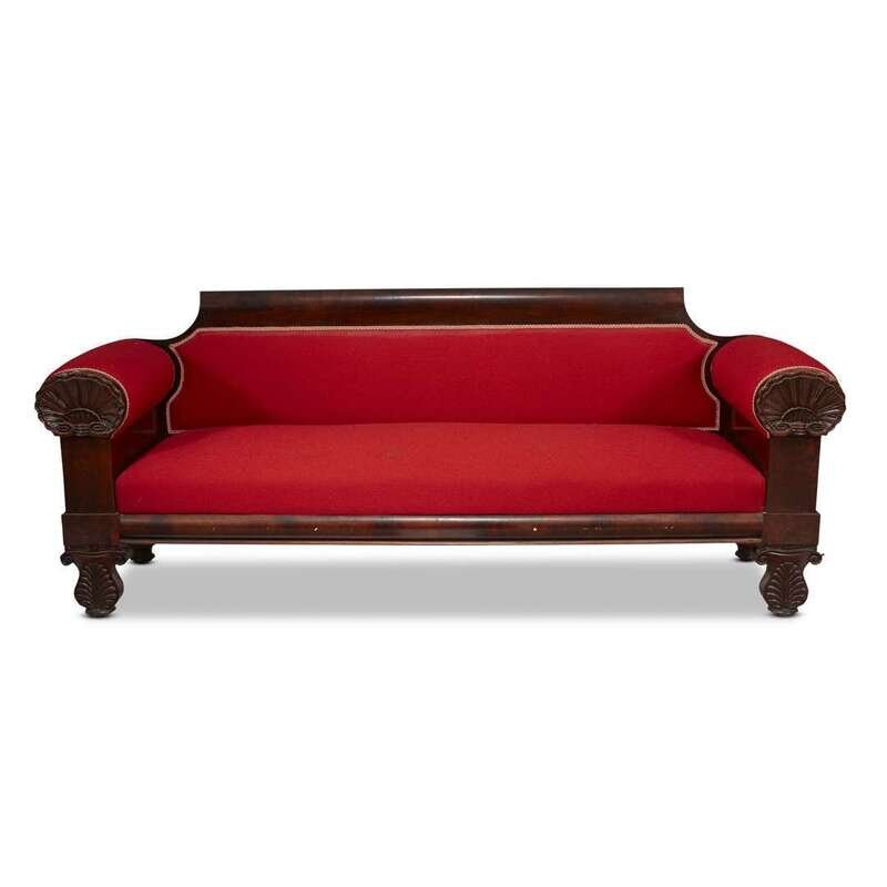 With shell-front armrests, and anthemion-carved feet; red upholstery.