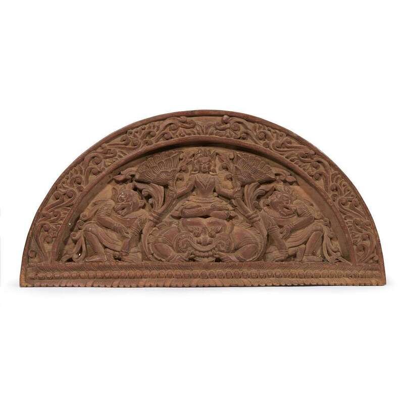 Possibly a keyhold cover, the top carved with a seated bodhisattva and demonic figures.