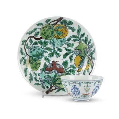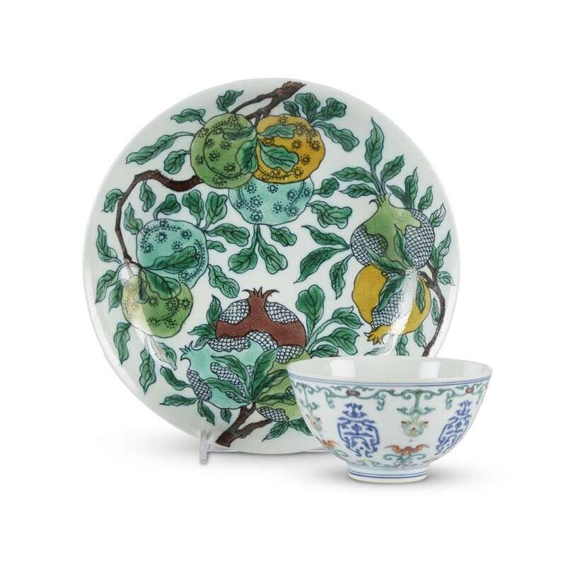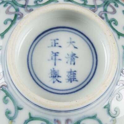 A Chinese porcelain incised and enameled "Sanduo" dragon dish, Kangxi six-character mark, and a doucai bowl, Yongzheng mark