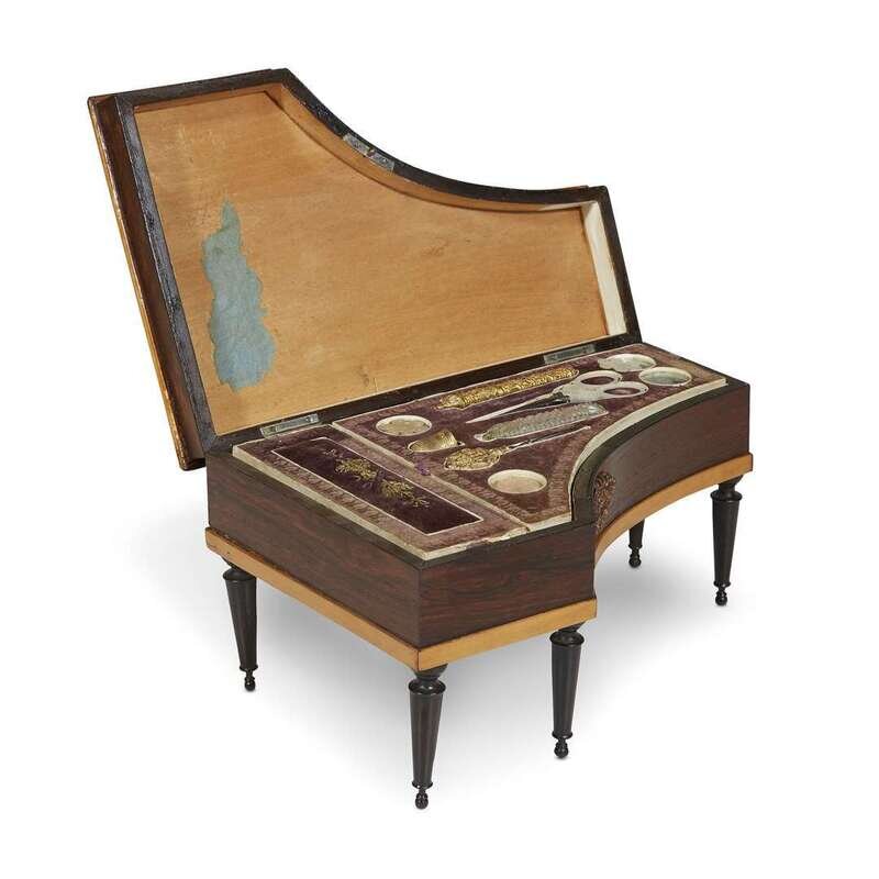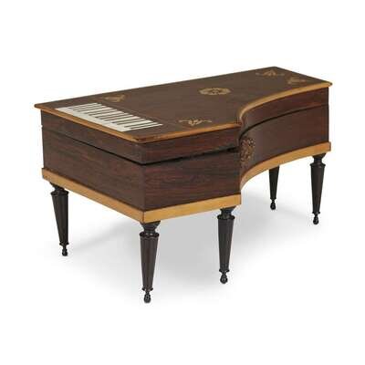 A Palais Royal style fruitwood inlaid rosewood harpsichord-form musical sewing box 19th century