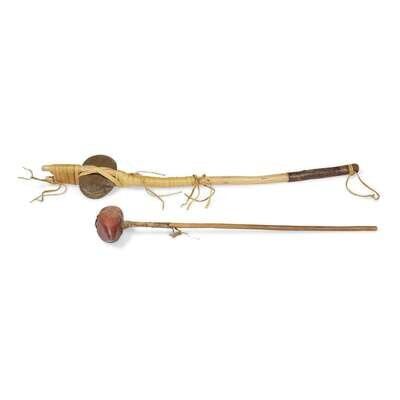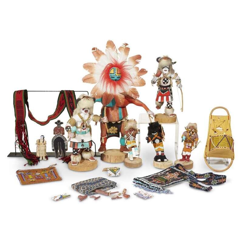 Comprising six Kachina dolls in descending height: "Sunflower," signed A. Smith, "White Buffalo" and other, each signed Anthony Ketto of St. Michael's, "Brown Buffalo Dancer," "Brown Owl," and "Black Buffalo Dancer," all signed Jefferson Dez; an Apache cradle board; two clubs; a beaded bag; a beaded pouch; three beaded napkin rings, one worked with beaded inscription "Rev. M.M.K.;" a beaded leather doll; a woven multicolored yarn belt; a painted wood cutout of a horse and rider; and a woven bag containing pipe stones. (18 total, excluding pipe stones).