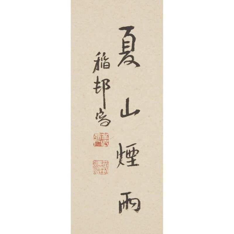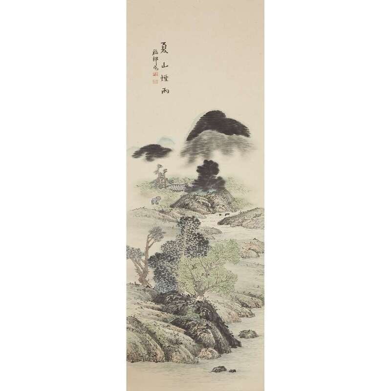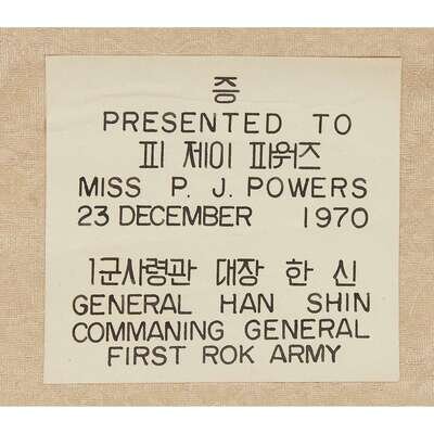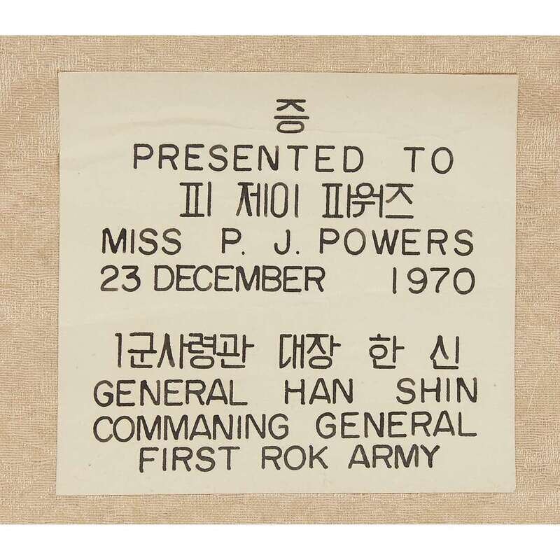 Ink and color on paper, signed with two seals upper left, with a dedicatory label printed "Presented to Miss P. J. Powers 23 December 1970, General Hanshin Commaning (sic) General First ROK Army", mounted as a hanging scroll. sight H: 42 3/4 in., 108.6cm; W: 12 1/4 in., 31.1cm