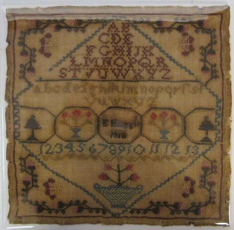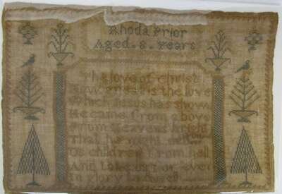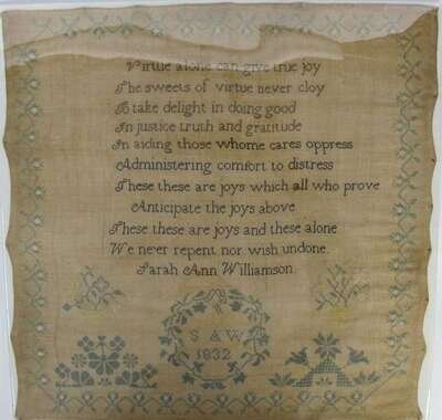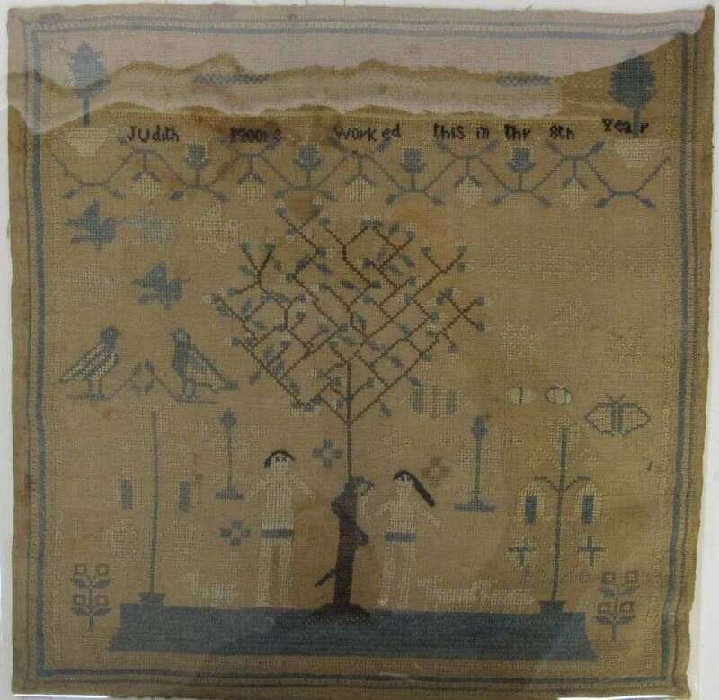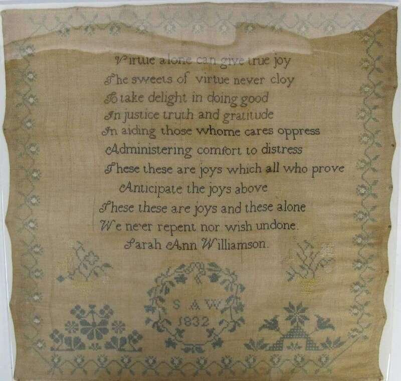 The first, worked by "Rhoda Prior, Aged 8 years," with spot devices of potted plants, trees and columns enclosing pious verse; the second, bearing inscription, "Judith Moore worked this in the 8th year," with Adam and Eve flanking apple tree, various spot devices; the third, worked by "Sarah Anne Williamson, 1832" with floral vine border, spot devices and verse; and the fourth, inscribed, "E Huggins" within reserve enclosed by alphabet, numbers, potted flowers, butterflies and strawberry vine, all four worked with polychrome silk threads on linen ground, unframed.