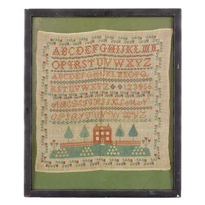 A strawberry border encloses rows of alphabet and panel with house flanked by trees, worked in polychrome silk threads, framed.