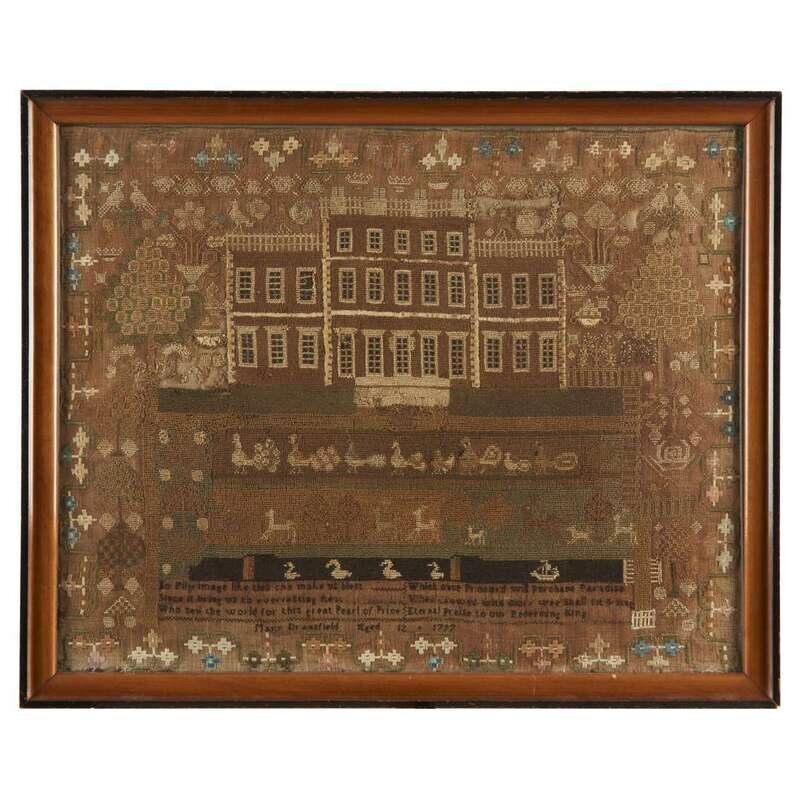 Worked with silk threads on wool ground, decorated with trees, flowers, birds, peacocks, and deer surrounding a manor house; framed.