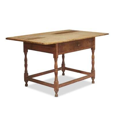 Rectangular top with breadboard ends on salmon-painted base fitted with a drawer on turned legs joined by stretchers.