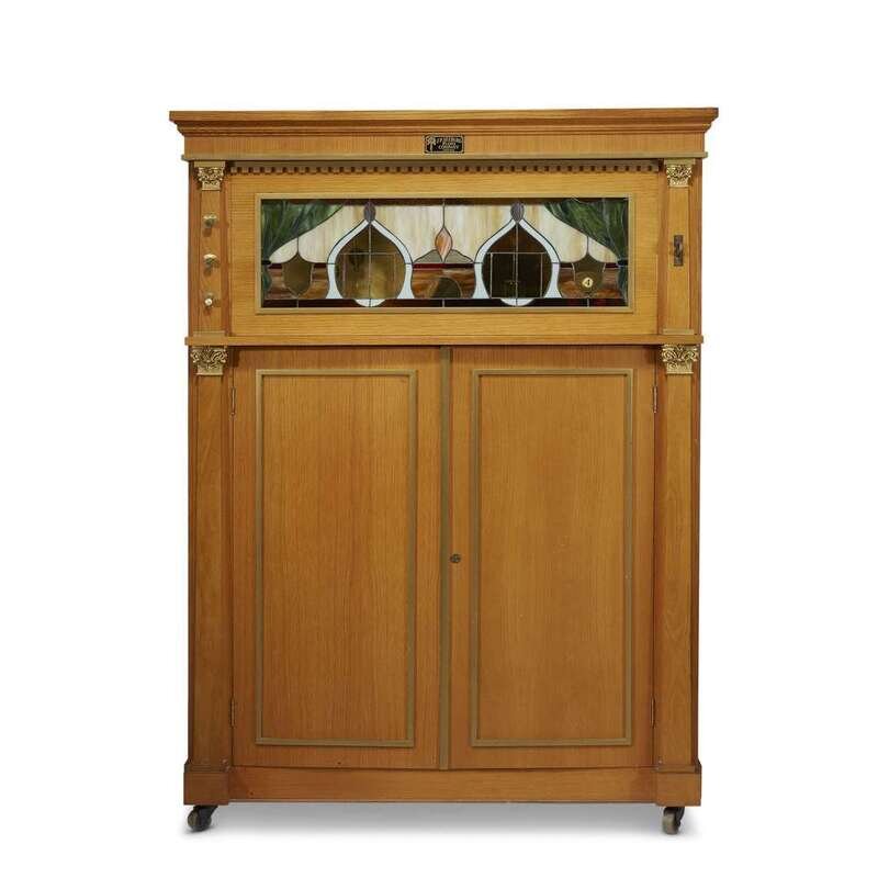 Oak case with stained glass panels, containing: mandolin, bass drum, tambourine, snare drum, triangle, wood block, castenets, tympany, xylophone and cymbal, listed in company literature as the "Ball Room Favorite," together with seven boxed music scrolls.