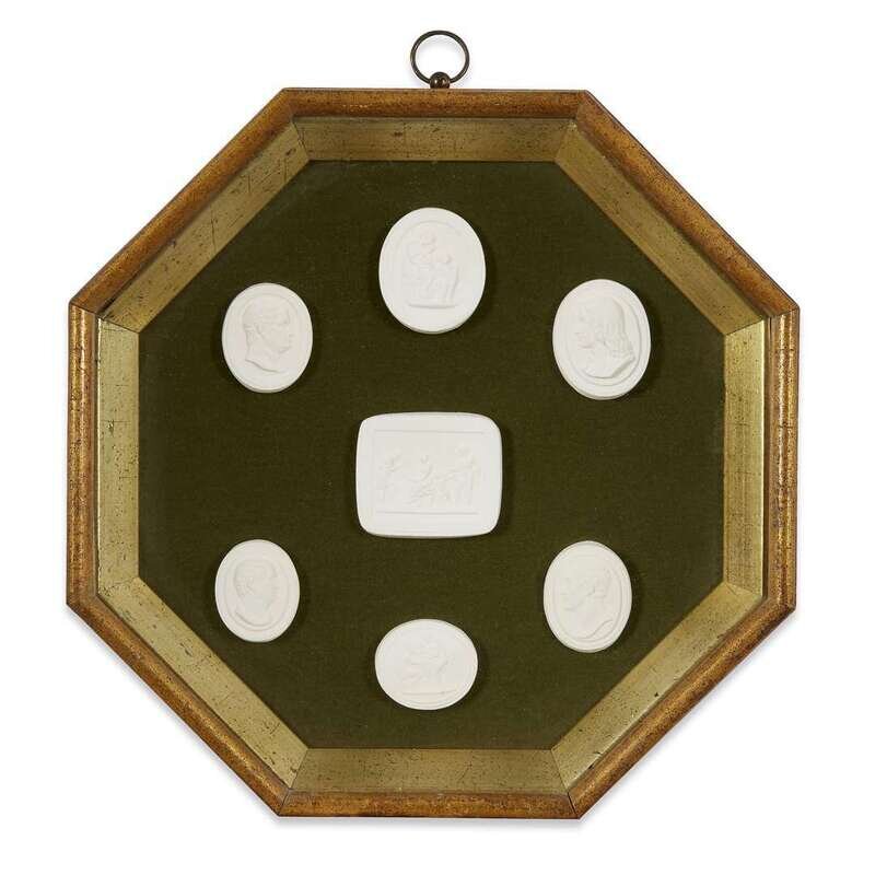 A framed set of seven Grand Tour style plaster intaglios 20th century