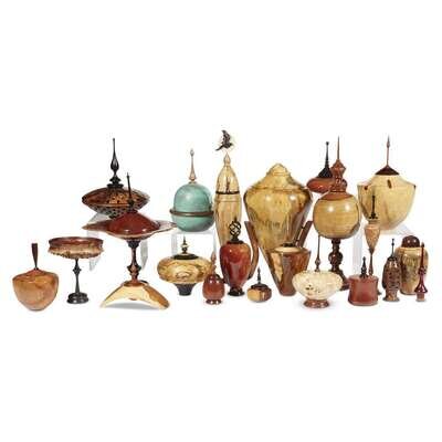 A COLLECTION OF TURNED AND CARVED WOOD VESSELS WITH FINIAL TOPS VARIOUS MAKERS