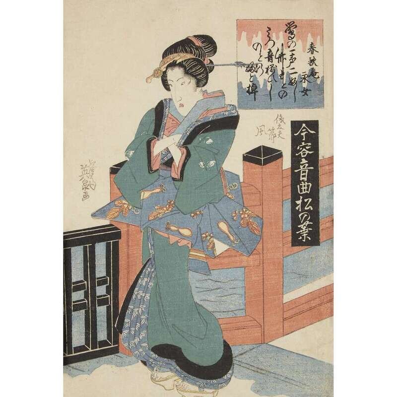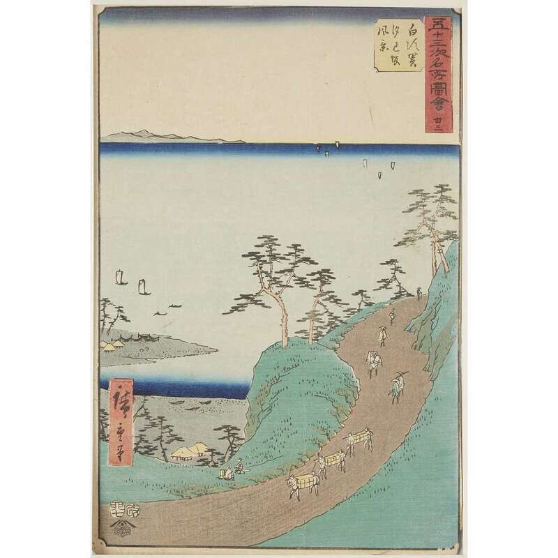 The Eisen depicting a bijin from the series of Pine Needles of Current Music (Imayo onkyoku matsu no ha); the Hiroshige a landscape scene (No. 33) "Shirasuka Shiomi-zaka fukei" from the series of Famous Sites of the Fifty-three Stations (Gojusan-tsugi Meisho Zue), 1855, publisher Tsuta-Kichi.Koeido; sight approximately H: 13 1/2 in., 34.3cm; W: 9 1/4 in., 23.5cm