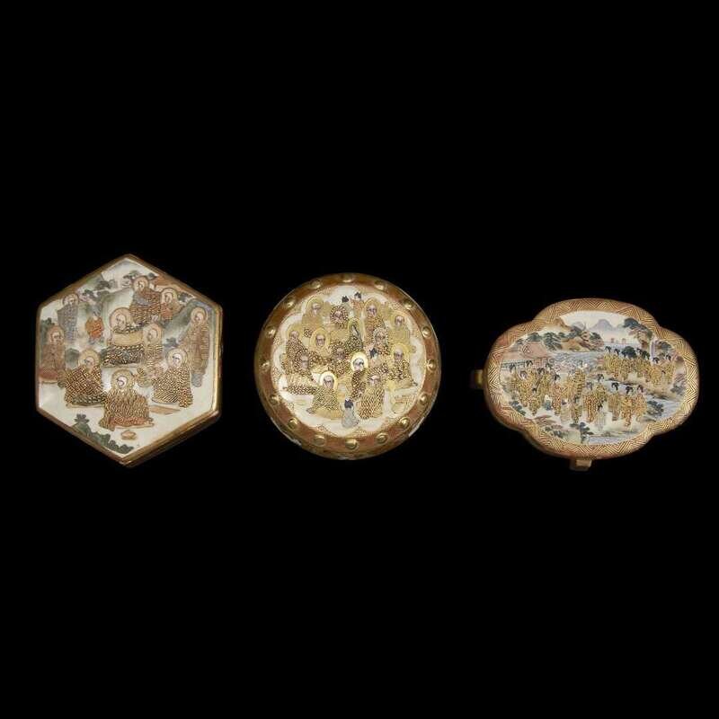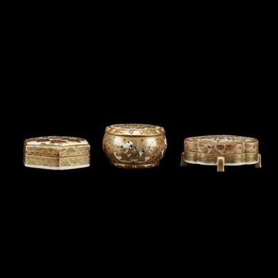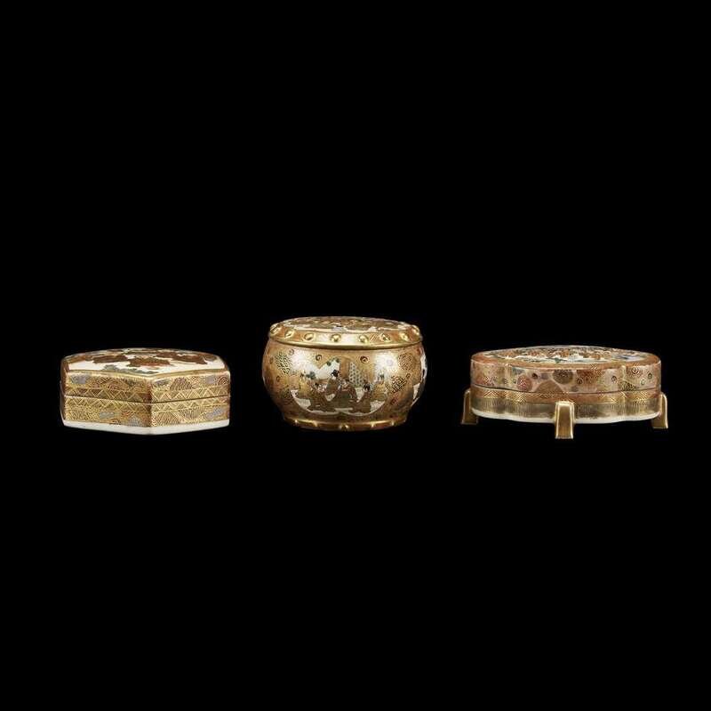 Comprising an hexagonal example, a drum-form example, and a lobed example on short legs. All signed on underside.